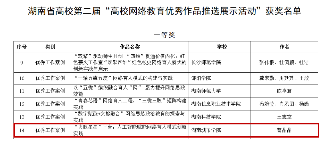 近日,由中共湖南省委网络安全和信息化委员会办公室、中共湖南省委教育工作委员会、湖南省教育厅联合举办的湖南省高校第二届“高校网络教育优秀作品推选展示活动”公布了入选作品名单,我院辅导员曹晶晶报送的《“火眼星星”平台:人工智能赋能网络育人模式创新实践》荣获优秀工作案例省级一等奖。