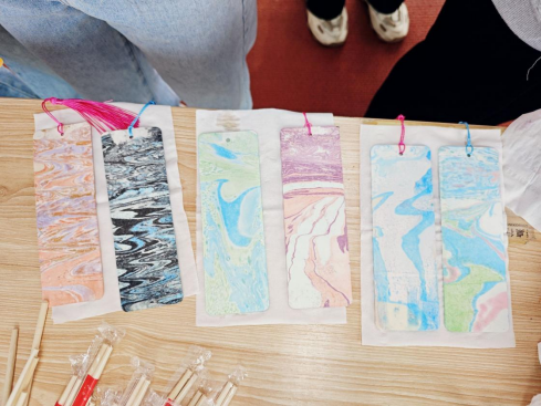 在非遗书签制作环节中,学生们自主运用大漆在水中调配色彩,并将书签浸染成形。活动现场气氛热烈,同学们积极投入色彩调配的实践过程,展现出对传统文化传承的浓厚兴趣。随着部分学生成功制作出色彩绚丽的书签,整体参与热情持续高涨,制作过程更为专注,将活动氛围推向高潮。现场交流互动频繁,欢声笑语不绝,展现出蓬勃的青春活力。